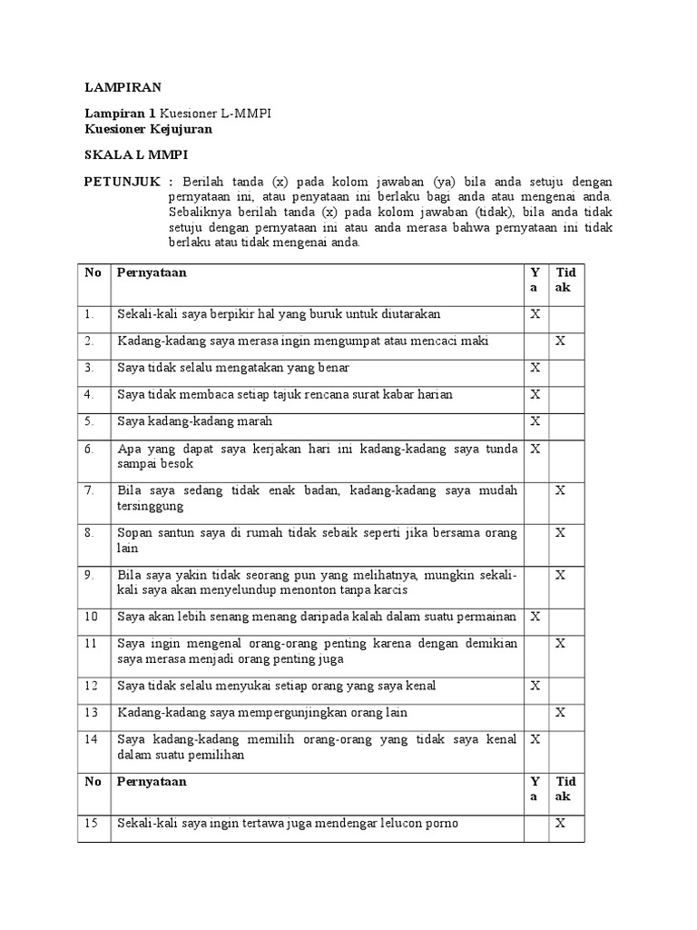 Mmpi 2 juga dapat digunakan untuk menilai stabilitas psikologis pada pekerja di berisiko tinggi 'profesi' seperti pilot pesawat, polisi atau pekerja dalam industri tenaga nuklir. Contoh soal psikotes dan jawabannya 1. Tes mmpi ini berupa ratusan pernyataan dengan alternatif pilihan jawaban berupa setuju (+) dan tidak setuju (+). Berikut kumpulan soal tes psikometrik tes psikologi mmpi 2. Jawaban dari pertanyaan tes mmpi sangat mudah dengan pilihan ya, tidak atau tidak tahu.